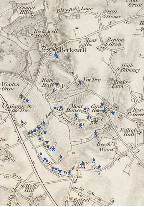 Land Tax records between 1773 and 1830 show the number of plots in Oldnall End rising from about 40 to about 60. Some of these were dwellings and some were land. The image below is adapted from the 1831 Ordnance Survey map; each star represents a residential building (in case of attached cottages, one star represents 2 or 3 dwellings). Altogether, the 1831 map shows 67 dwellings, all of which are accounted for on the 1839 Tithe Apportionment.